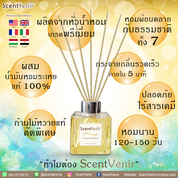 ก้านไม้หอม น้ำหอมกระจายกลิ่น (Premium Fragrance Reed Diffuser) ของ “เซ้นท์วิเนียร์” (ScentVenir) เป็น ก้านไม้หอม จากน้ำหอมชั้นเลิศ ซึ่งเป็นสูตรพิเศษอันเป็นเอกลักษณ์ มีความเข้มข้นสูง เกิดจากน้ำมันหอมระเหยแท้ 100% ผสานเข้ากันอย่างลงตัวกับหัวน้ำหอมเกรดสูง ที่คัดสรรกันมาเป็นพิเศษ เป็นน้ำหอมปรับอากาศ ที่สามารถสร้างบรรยากาศและความทรงจำอันยอดเยี่ยมอันยากที่จะลืมเลือนในทุกครั้งที่เปิดใช้